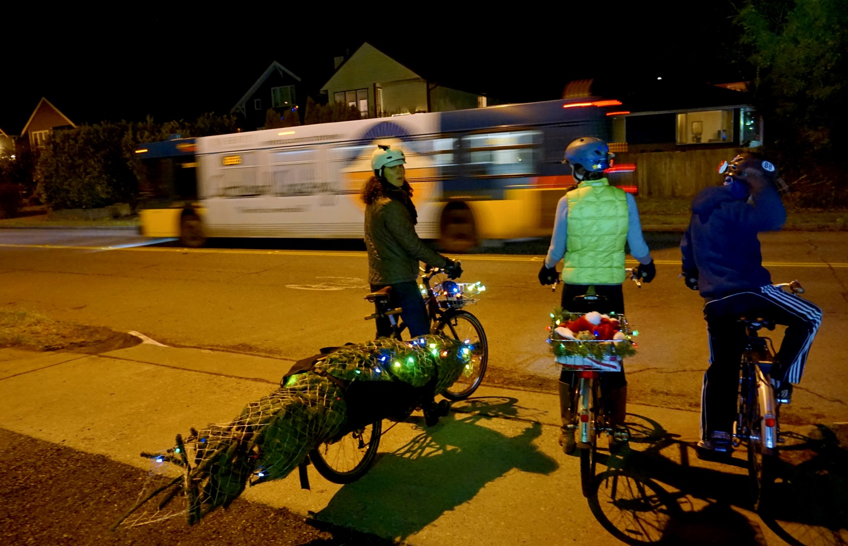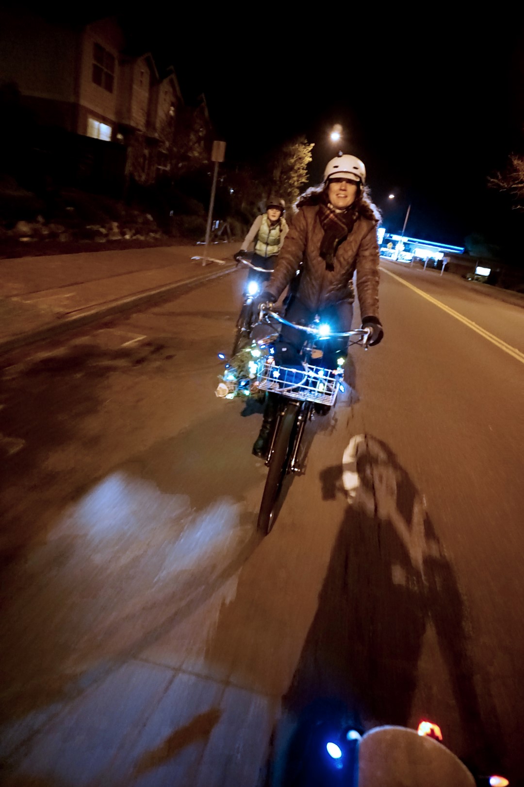 bikesAs we were prepping to leave for the tree lot, I strung lights through the baskets, Snapdecks and frames on four of our bikes. I lit up my commuter bike for our daughter to ride, since it was already out, and it fits her! No saddle-height-adjustment needed!