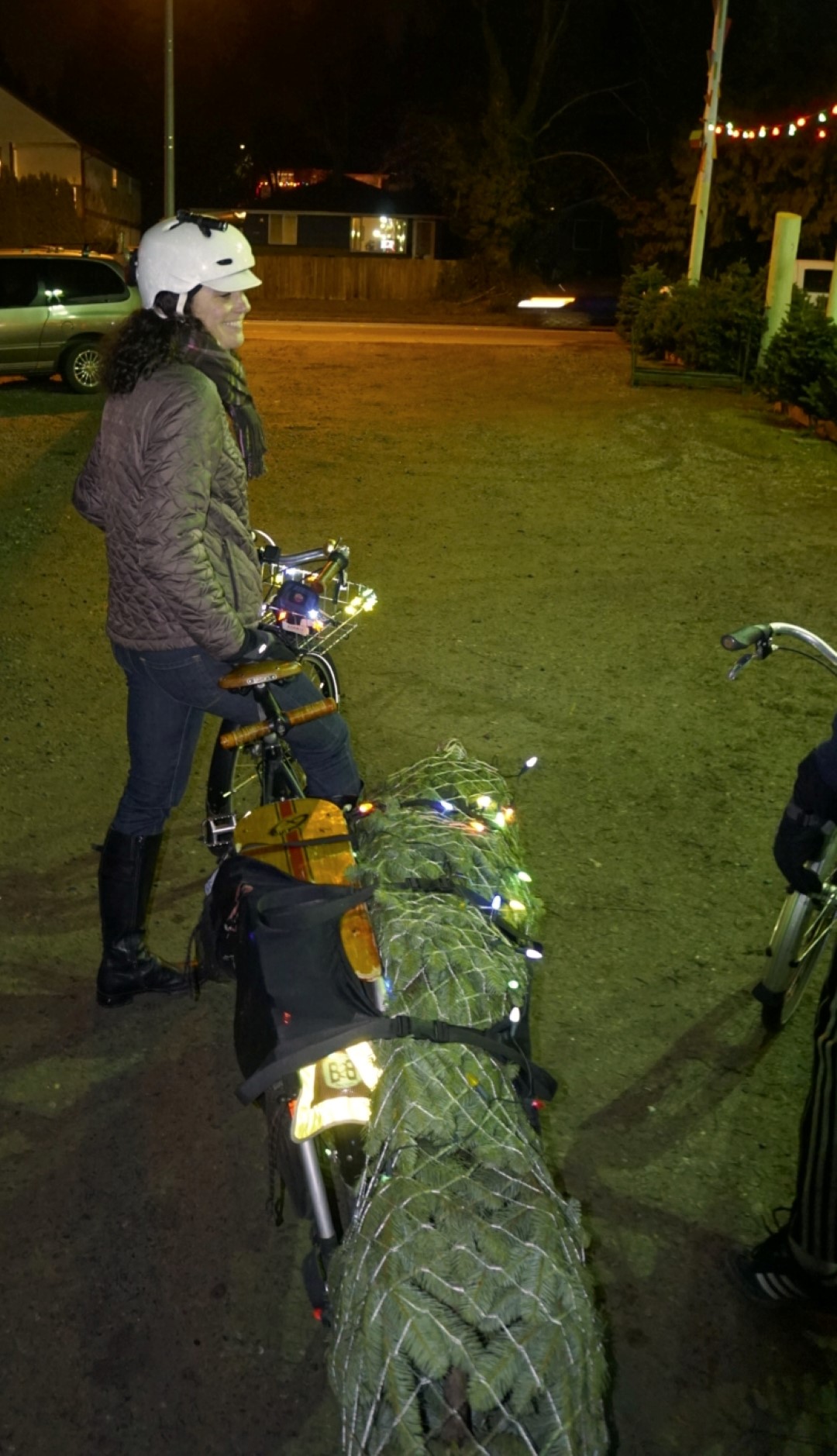 Tree and bikes_DSC8679 (Large)This is our obligatory eighth-annual Christmas tree by bike post. Tree-hauling is old hat by now, but I thought I’d post some photos of this year’s adventure anyway. You might remember that last year our daughter hauled the tree. When we discussed who would pedal the tree home this year, I realized I’d never done it. How did I pass on all of those tree-hauling opportunities over the years? Naturally I volunteered for the task.